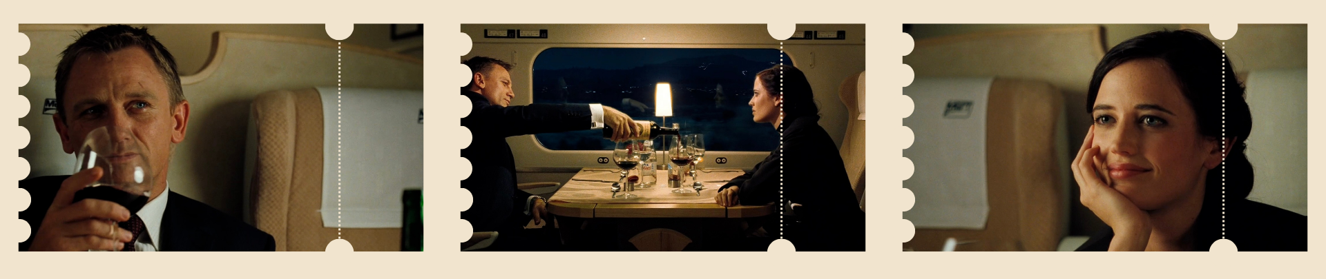 De trein-scène voelt als een compleet andere wereld. Hier geen machtsvertoon, maar subtiliteit. Rode wijn wordt ingeschonken en alles vertraagt.